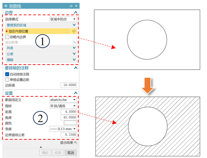,可以快速指定填充区域和填充图样,其一般使用步骤为:选择剖面线区域(默认选择模式为区域中的点,单击剖面线区域内任意位置,软件会自动判断该区域的边界范围,注意高亮橙色边界线)→点击预览即可查看剖面线→剖面线范围和样式(可根据需要设置填充图样、距离、角度、颜色、宽度等参数)→确定关闭窗口或应用继续完成其他剖面线创建。