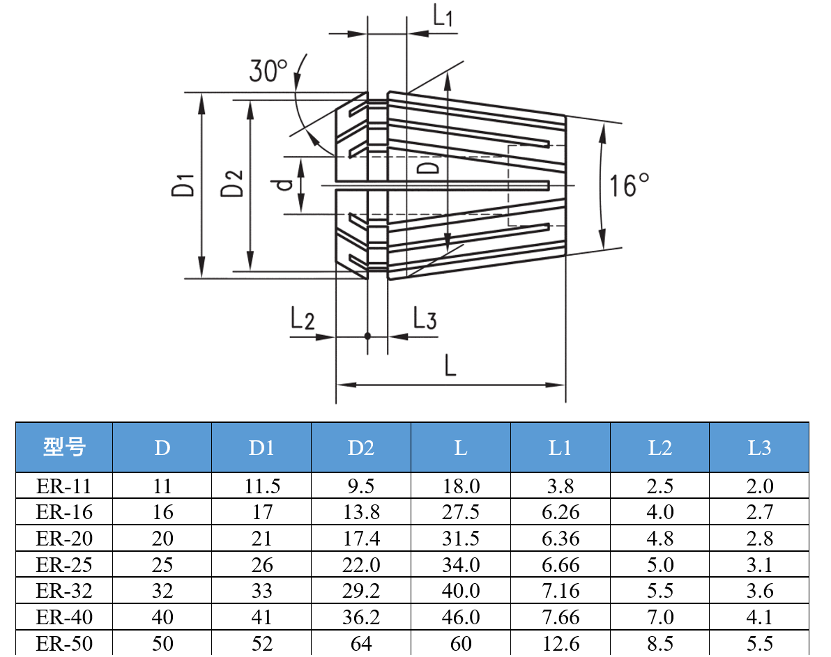 3、ER筒夹系列型号尺寸
