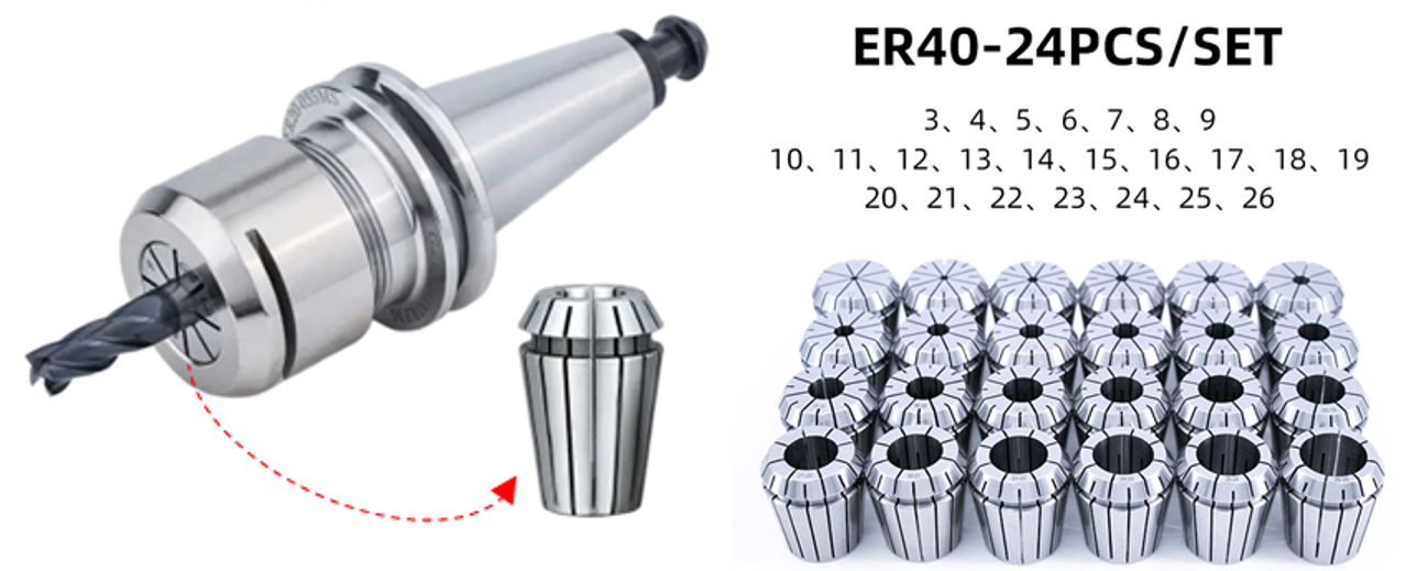 ER筒夹有不同的型号,最常用的类型是ER16、ER20、ER25、ER32 和 ER40,每种型号可加持的刀具尺寸范围不同,例如ER40可夹持刀具直径范围从3mm至30mm。