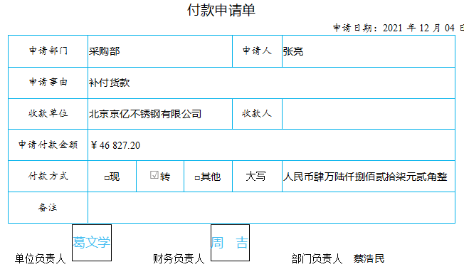 业务17:2021年12月4日,企业向北京京亿不锈钢有限公司支付剩余40%的货款。