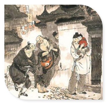 士隐知投人不著,心中未免悔恨,再兼上年惊唬,急忿怨痛已伤,暮年之人,贫病交攻,竟渐渐的露出那下世的光景来。可巧这日拄了拐杖挣到街前散散心时,忽见那边来了一个跛足道人,疯癫落拓,麻鞋鹑衣,口内念着几句言词道: