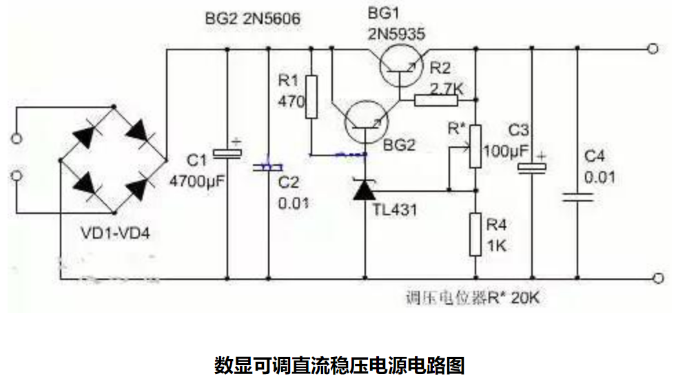 10A可调稳压电源电路图与普通串联型稳压电源基本相同,所不同的是使用了具有温度补偿特性的,高精度的标准电压源集成电路TL431,所以电路简单,易于制作,且稳压性能很高。图中电阻R4,稳压集成电路TL431和可调电位器R*组成一个连续可调的恒压源,为BG2基极提供基准电压,稳压集成电路TL431的稳压值连续可调,这个稳压值决定了稳压电源的最大输出电压,如果想把可调电压范围扩大,可以改变R4和可调电位器的电阻值。