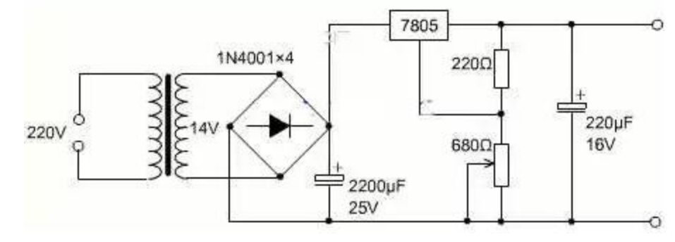 这里选用7805制作了一个5V~12V连续可调的直流稳压电源实例。图中R1、R2的取值决定了输出电压的可调范围,按照图示取值可在5~12V稳压范围内实现输出电压连续可调。最高输出电压受三端稳压器最大输入电压及最小输入输出压差的限制,7805最高输入电压为35V,输入输出压差要保持在2V以上,因此该电路中由于稳压器的直流输入电压约为15V,所以该电路的输出电压最大值设定为12V。