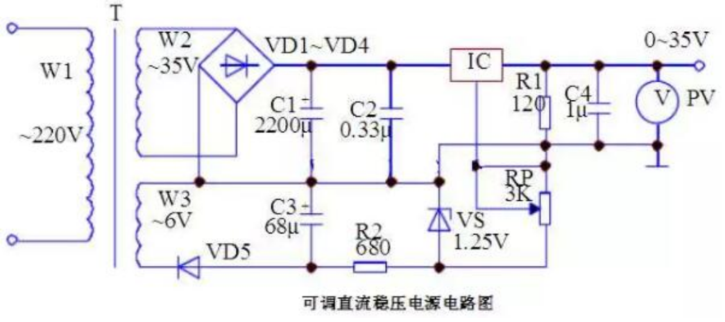 电路工作原理:本电路通过变压器T把220V的交流电压加在一次侧W1后,在二次侧W2和W3分别得到35V和6V的交流电压,二次侧W2端通过二极管VD1~VD4整流、电容器C1、C2滤波后输入到IC三端集成稳压电路的输入端,通过由IC稳压集成电路、电阻器R1和电容器 C4输出35V的直流电压。二次侧的W3线圈输出的6V的交流电压通过二极管VD5、电容器C3、电阻器R2和稳压二极管VS输出一个-1.25V的负电压作为辅助电源。变阻器RP加在IC集成电路的控制端,通过调节变阻器RP能够使输出端输出0~30V的直流电源。IC选用LM317三端稳压集成电路;R1、R选用1/2W型金属膜电阻器;C1、C3选用耐压分别为50V和10V的铝电解电容器,C2、C4选用CD11—16V电解电容器;VD1~VD5选用IN4007硅型整流二极管;VS选用IN4106或2CW60硅稳压二极管;RP可用WSW型有机实心微调可变电阻器;T选用10W、二次侧电压为35V和6V的电源变压器。