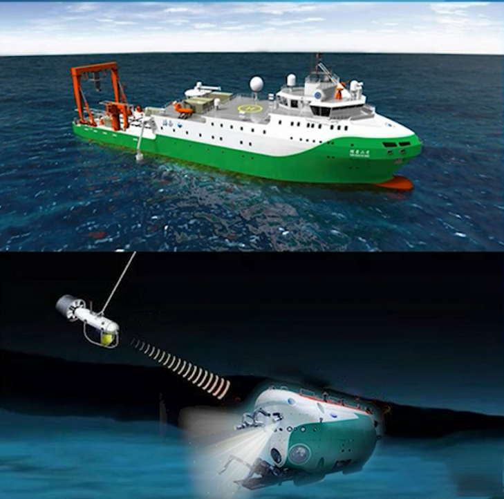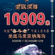 2020年11月10日8时12分,中国“奋斗者”号载人潜水器在马里亚纳海沟成功坐底,坐底深度10909米。