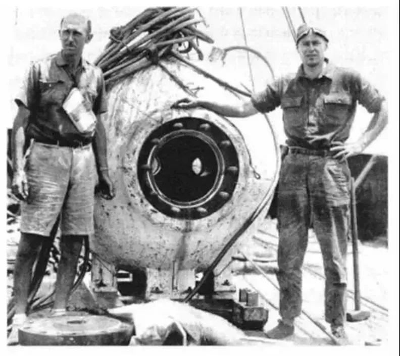 深海的巨大水压为有别于潜艇的深潜器提出了完全不同的要求。1928年,美国人巴顿用钢铁制造了一个球形潜水装置。这个“球”内置简单的照明、呼吸和通信设施,至于动力系统、生命维持系统之类的现代深潜器标配更是没有,只是靠着与母船连接的一条钢索+电缆下潜与上浮。