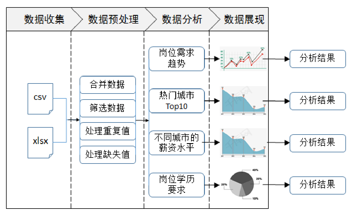 随着大数据领域的不断拓展,海量数据已经全面地融入人们的社会生活,基于海量数据的分析人才逐渐成为各企业追逐的宠儿。大数据这一热门行业衍生了众多与数据相关的岗位,在这些岗位中数据分析师岗位脱颖而出,受到业界人士的广泛关注。为了从多个角度了解数据分析师岗位的实际情况,本章从数据分析的角度出发,结合从招聘网站上收集的有关数据分析师岗位的数据,利用pandas、matplotlib库处理与展现数据,开发一个完整的数据分析项目。