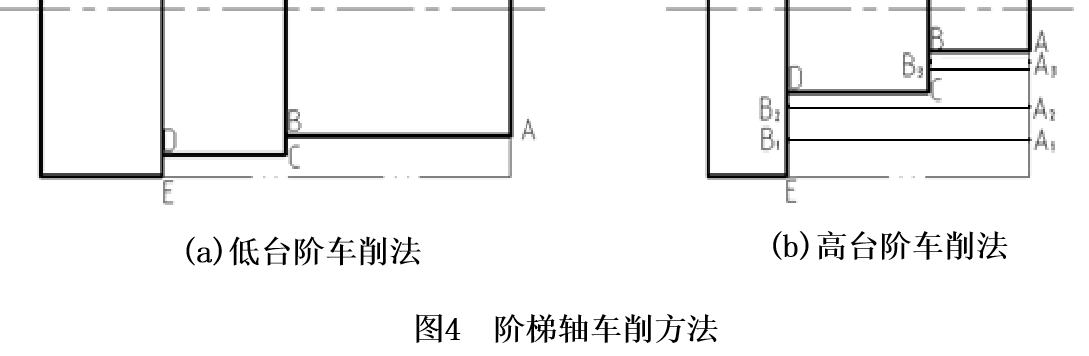 相邻两圆柱体直径差较小,可用车刀一次切出。加工路线为A→B→C→D→E。如图4a所示。