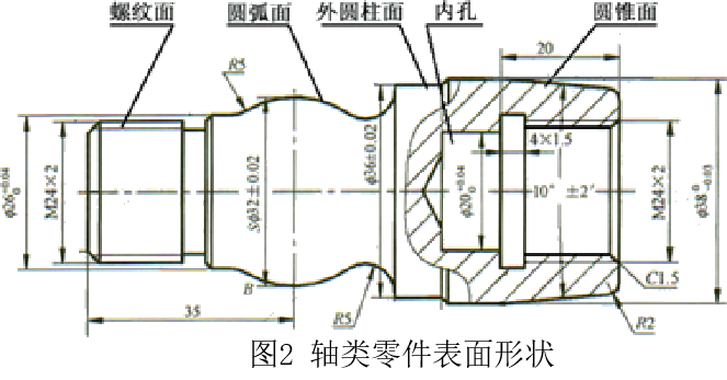 轴类零件可由车床加工成型的的表面形状有:外圆柱面、内孔、圆锥面、螺纹面、圆弧面等,如图2所示: