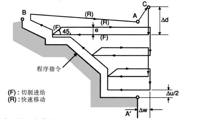 该指令适用于车削圆棒料毛坯,需多次走刀才能完成的外圆和内径的粗加工。走刀路线如下图1所示: