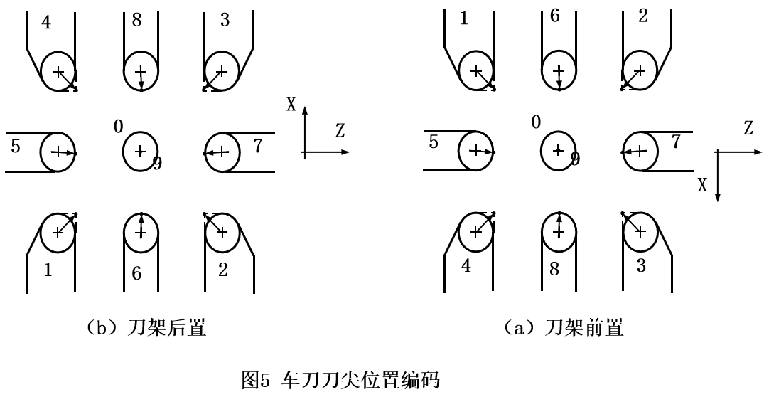 图5a所示为刀架前置的数控车床刀具刀位点位置的情况;图5b所示为刀架后置的数控车床刀具刀位点位置的情况。编码“0”或“9”是以刀尖圆弧中心作为刀位点的车刀位置编码。