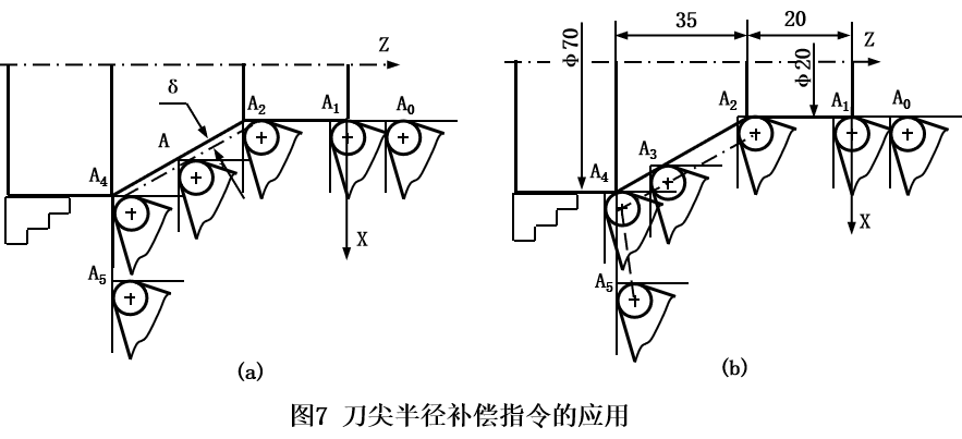 如图7所示工件,试采用刀尖半径补偿指令编写程序。如图7a所示,未采用刀具半径补偿指令时,刀具以刀尖轨迹运动,圆锥面产生误差δ。采用刀具半径补偿指令后,如图7b所示,加工表面无形状误差。