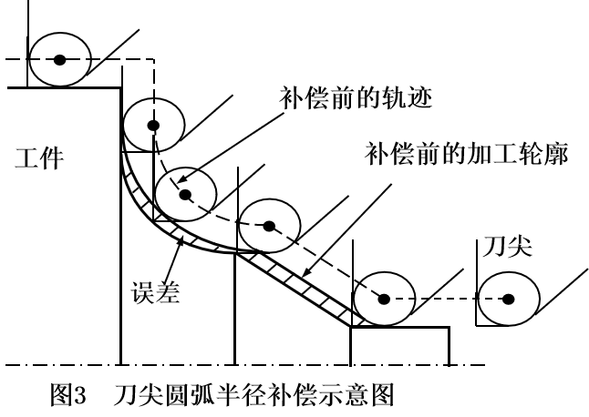 一般数控系统具有刀具半径补偿功能。编程时,只需按工件的实际轮廓尺寸编程而不必考虑刀尖圆弧半径的大小,加工时,数控系统能根据刀尖圆弧半径自动计算出补偿量,进行精确的补偿,如图3所示,避免少切或过切现象的产生。