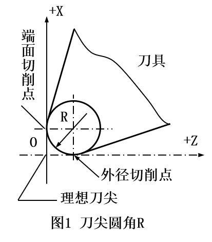 数控车编程加工时,通常将车刀刀尖作为一点来编程和对刀的。实际加工中,一般将车刀刀尖处磨成圆弧过渡刃,如图1所示。实际的切削刃是刀尖圆弧各切点。当车削与轴线平行或垂直的圆柱表面或端面时,刀尖圆弧不会产生加工误差,但当车削倒角、锥面、圆弧及曲面时,则会产生少切或过切现象,如图2所示。