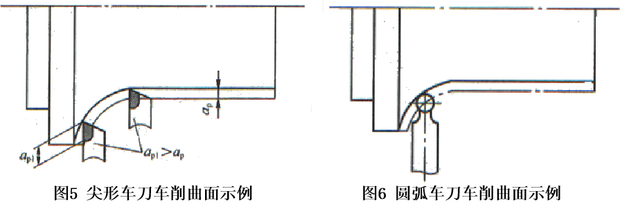 圆弧形车刀适宜于车削精度要求较高的凹曲面或半径较大的凸圆弧面。例如,当图5所示零件的曲面精度要求不高时,可以选用尖形车刀进行加工;当曲面精度要求较高时,在靠近其圆弧终点时,切削深度将大大超过其圆弧起点位置的切削深度,致使切削阻力增大,可能产生较大的线轮廓度误差,增大其表面粗糙度。此时应选择圆弧形车刀切削,如图6所示。