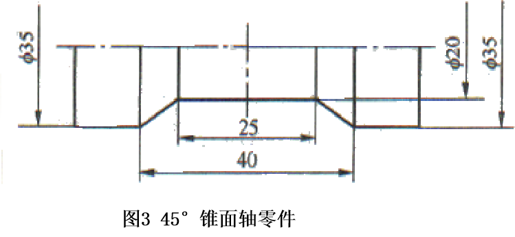 尖形车刀几何参数的选择方法与普通车削时基本相同,但应结合数控加工的特点,如走刀路线、加工干涉等进行全面考虑。如图3所示的零件加工时,若使其左右两个45°锥面由一把车刀加工出来,则车刀的主偏角应取50°~55°,副偏角取50°~52°。这样既保证了刀头有足够的强度,又利于主、副切削刃车削圆锥面时不致发生加工干涉。