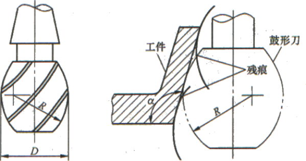 图5所示为一种典型的鼓形铣刀,它的切削刃分布在半径为R的圆弧上,端面无切削刃。加工时控制刀具上下位置,可以在工件上切出从负到正的不同斜角。R越小,所能加工的斜角范围越广,但表面质量也越差。鼓形铣刀刃磨困难,切削条件差,且不适于加工有底的轮廓表面。