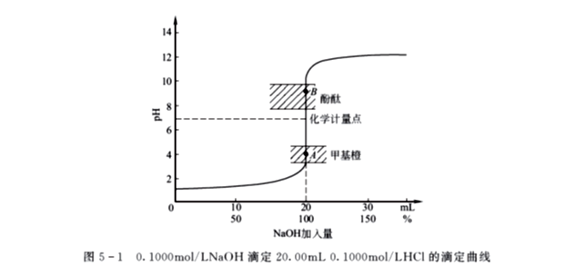 如果以NaOH溶液的加入量为横坐标,对应溶液的pH为纵坐标,绘制关系曲线,则得到图5-1所示的滴定曲线。