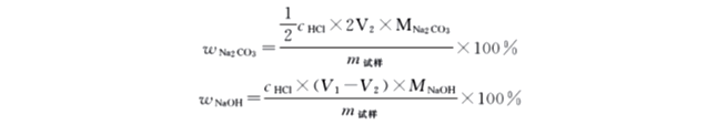 因Na2CO3被HCl中和先生成NaHCO3,继续用HCl滴定使NaHCO3又转化为H2CO3,二者所需HCl量相等,故V1-V2为中和NaOH 所消耗HCl的体积,2V2 为滴定Na2CO3所需HCl的体积。分析结果计算公式为