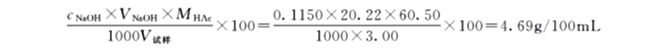 【例5-10】吸取食醋试样3.00 mL,加适量的水稀释后,以酚酞为指示剂,用0.1150 mol/L NaOH 标准溶液滴定至终点,用去20.22 mL,求食醋中总酸量(以HAc表示)。
