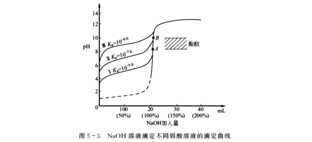 除了浓度影响滴定突跃之外,弱酸的强度也影响突跃范围的大小。浓度相同而强度不同的弱酸,酸解离常数Ka 越大,滴定突跃越大;反之,越小。当弱酸的浓度为0.1mol/L,Ka≤10-9时,其滴定突跃已不明显,无法用一般的指示剂确定滴定终点。酸碱越弱或浓度越小,反应就越不完全。