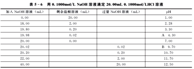 从图5-1和表5-6可以看出,从滴定开始到加入NaOH溶液19.98 mL为止,溶液pH 从1.00增加到4.3,仅改变了3.30个pH 单位。所以此段曲线比较平坦。