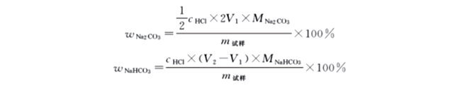 工业纯碱中常含有NaHCO3,此二组分的测定可参照上述NaOH + Na2CO3的测定方法。但应注意,此时滴定Na2CO3所消耗的HCl体积为2V1,而滴定NaHCO3所消耗的HCl体积为V2-V1分析结果计算式为