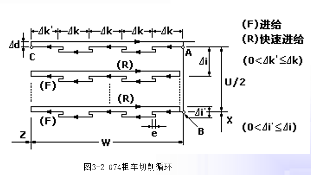 (1)G74循环用于深孔的断续加工,也可用于端面圆环槽的断续加工,如图3-2所示。