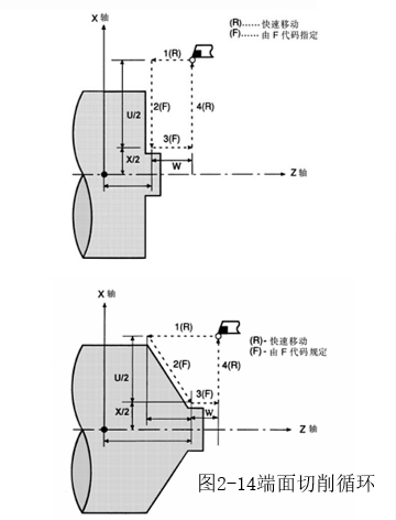 (2)R 为斜端面切削起点减去切削终点的 Z 坐标值。(如为平端面,则 表示为 R0,可以省略,指令变为 G94 X(U)-Z(W)- F-)。