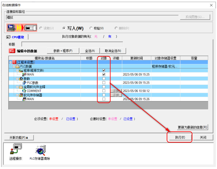 需要将修改后的程序下载到仿真器中时,依次单击菜单栏中的“在线”——“PLC写入”进入程序写入界面。在该界面可以根据需要勾选需要写入到PLC中的内容。