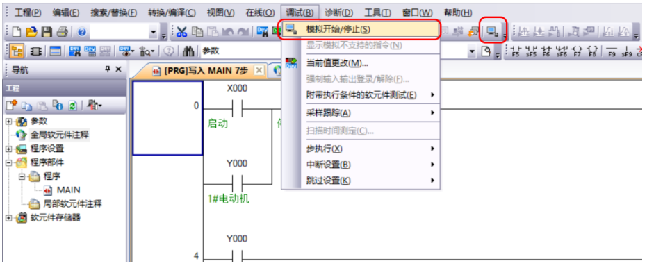 程序转换/编辑无误后依次单击菜单栏中的“调试”——“模拟开始/停止”或直接单击工具栏中的“电脑”图标进入仿真模式。