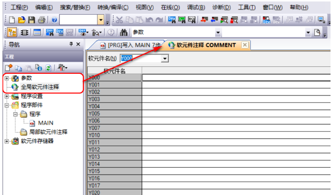 单击导航窗口中“参数”选项卡下的“全局软元件注释”进入软元件注释界面。