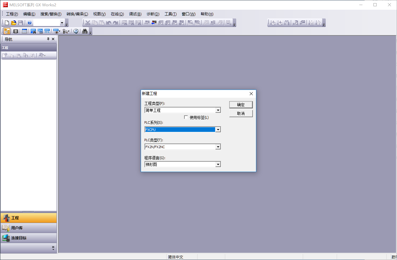 在新建工程界面中可以选择PLC的系列、机型、工程类型、程序语言以及是否使用标签等内容(本文以新建简单工程为例)。