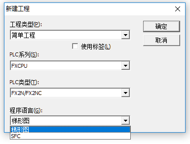 程序语言:在简单工程类型下只能选择梯形图或SFC(顺序功能图)两种语言。