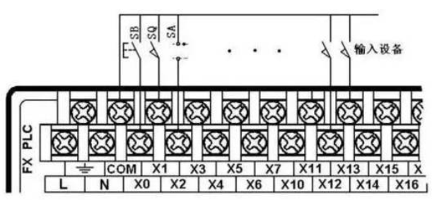 下图是与按钮、行程开关、转换开关等主令电器类输入设备的接线示意图。图中的PLC为直流汇点式输入,即所有输入点共用一个公共端COM,同时COM端内带有DC24V电源。若是分组式输入,也可参照下图的方法进行分组连接。