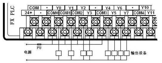 PLC与输出设备连接时,不同组(不同公共端)的输出点,其对应输出设备(负载)的电压类型、等级可以不同,但同组(相同公共端)的输出点,其电压类型和等级应该相同。要根据输出设备电压的类型和等级来决定是否分组连接。如图6所示以FX2N为例说明PLC与输出设备的连接方法。图中接法是输出设备具有相同电源的情况,所以各组的公共端连在一起,否则要分组连接。图中只画出Y0-Y7输出点与输出设备的连接,其它输出点的连接方法相似。