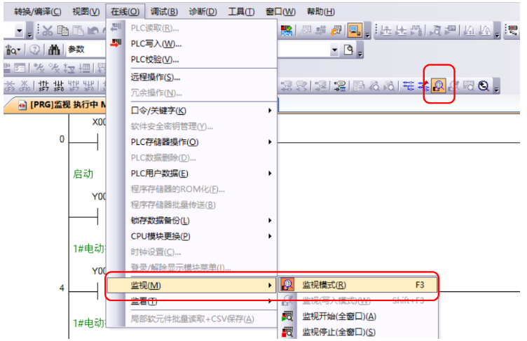 在菜单栏中依次单击“在线"——"监视”——“软元件/缓冲储存器批量监视”进入批量监视界面。