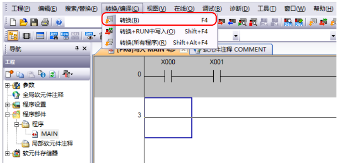 在菜单栏中依次单击“转换/编译”——“转换”或者直接使用快捷键“F4”对程序进行转换/编译。