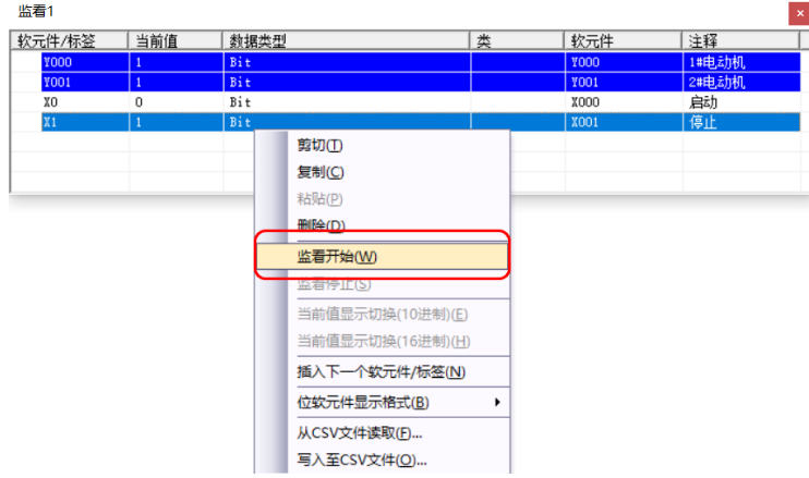 在程序编辑窗口单击鼠标“右键”,选择“登录至监看窗口"。在监看窗口中输入软元件名称后单击鼠标“右键”选择“监看开始”,在监看过程中可以通过修改当前值改变软元件的状态,监看结束后按同样步骤选择“停止监看”。