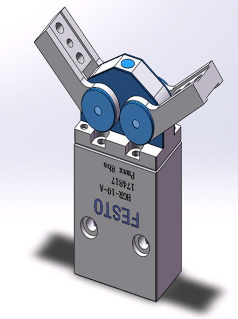 旋转夹爪的动作是按照齿条的啮合原理工作的。活塞与一根可上下移动的轴固定在一起。轴的未端有三个环开槽,这些槽与两个驱动轮的啮合。因而,气动手指可同时移动并自动对中,齿轮齿条原理确保了抓取力度始终恒定。