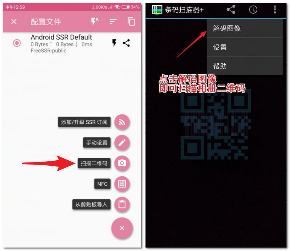 注意:这里不是打开条码扫描器,是打开SSR点击扫描二维码,然后在SSR中选择使用条码扫描器+进行扫码