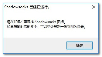 Shadowsocks在运行正常情况下,打开Shadowsocks会提示Shadowsocks已经在运行,和Shadowsocks异常运行是不一样的。