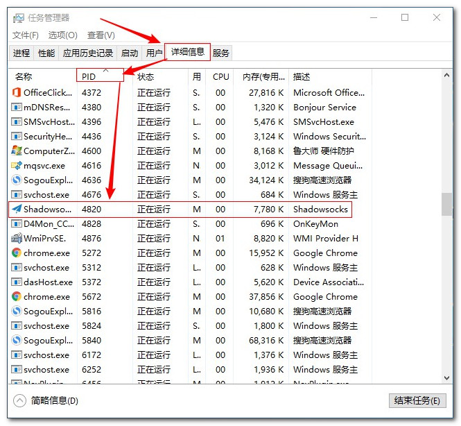 切换到“详细信息”选项卡(Windows10)或者“进程”选项卡(Windows7),在PID一列查看对应的进程,然后右击结束任务,再重新启动Shadowsocks即可。