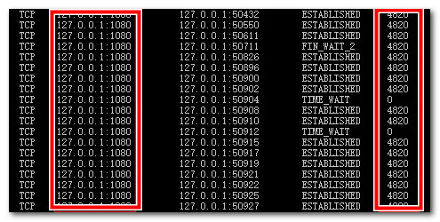 在第一步的命令窗口中可以看出 PID 为 4820 的进程占用了1080端口,然后在下面的任务管理器中找到PID为4820的进程,结束进程即可。(这里为了演示用,看到4820进程的正是Shadowsocks)