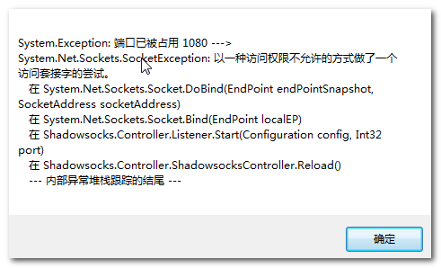 Shadowsocks没有被正常关闭,有残留进程,导致端口未释放,按快捷键Ctrl+Alt+Delete打开任务管理器找到Shadowsocks并结束任务,再重启Shadowsocks就正常了。