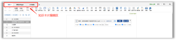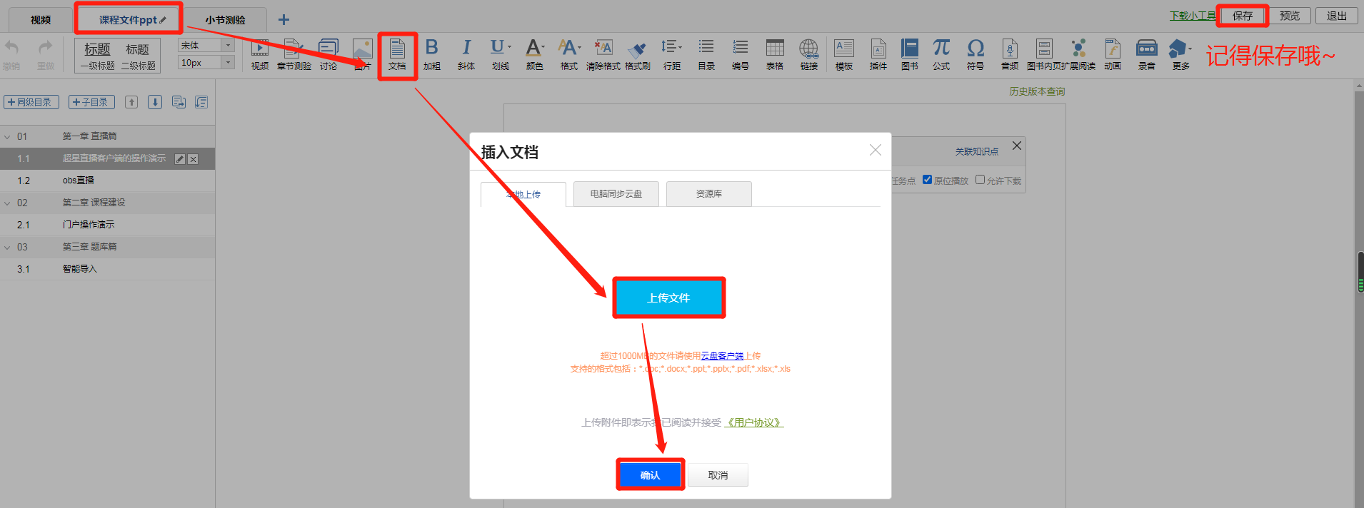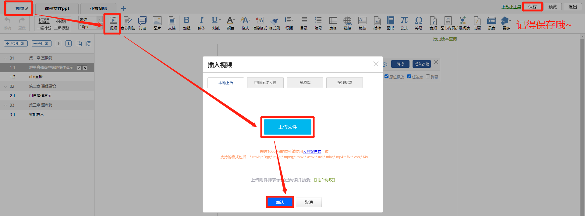 9. 编辑界面提供多种格式的上传按钮,老师根据实际情况选择对应的按钮,上传课程资源。上传完成后,右上角记得保存!