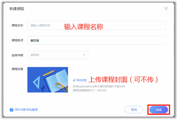 2.输入课程名称,上传课程封面(没有封面可暂时不上传),点击完成。刷新界面出现刚才建的课程。