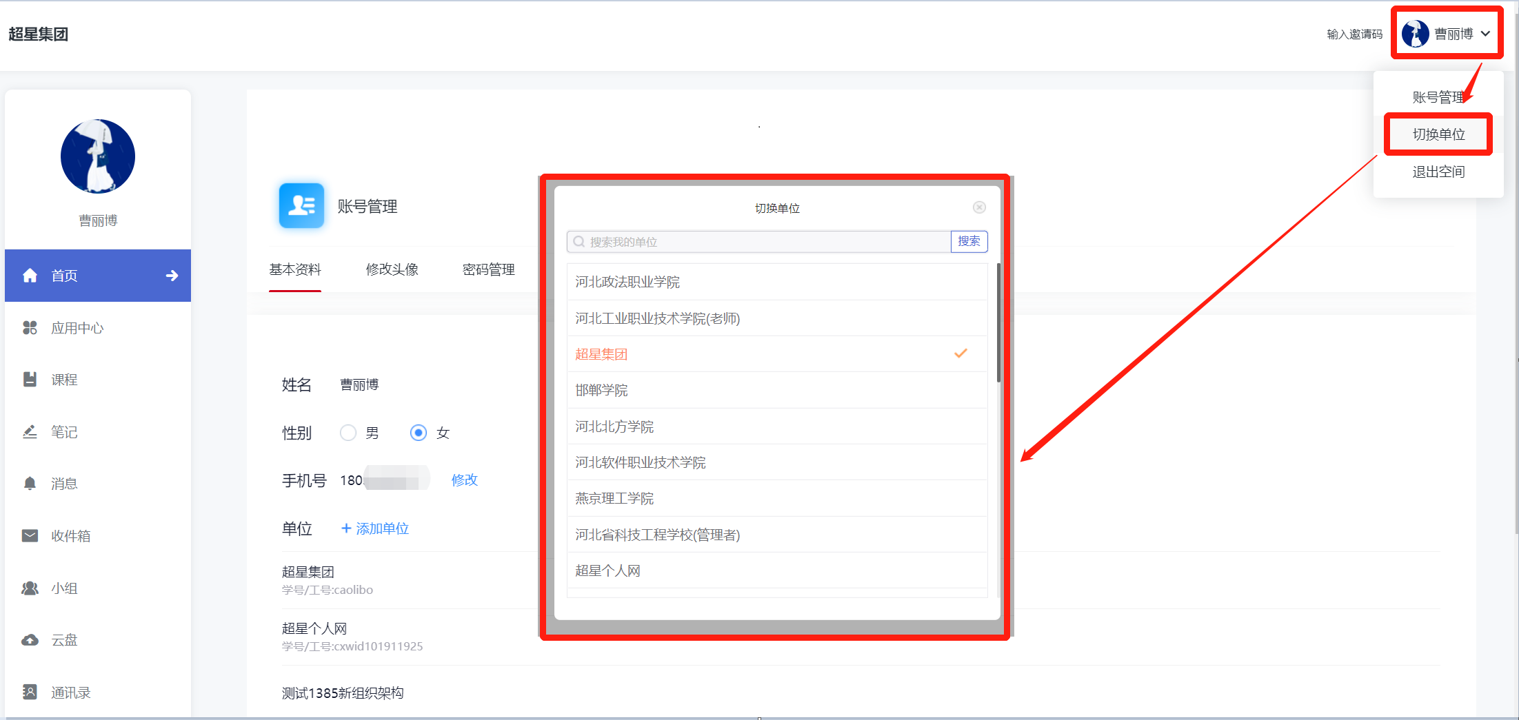 在电脑上浏览器输入网址:i.chaoxing.com,登录后,查看页面左上角的单位名称,是否为要使用的单位名称。如果不是,需要点击右上角头像姓名处,点击【切换单位】,切换到要使用的单位界面。