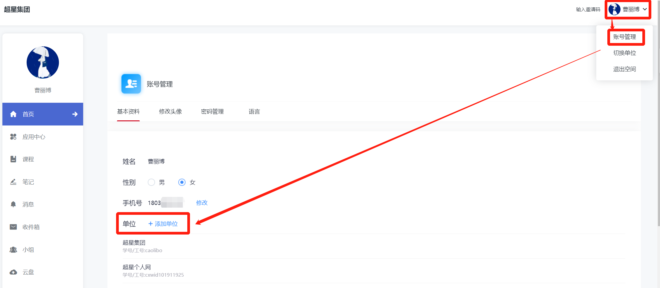 在电脑上浏览器输入网址:i.chaoxing.com,登录后,点击右上角头像姓名处,点击【账号管理】,找到【添加单位】,可以绑定当前单位。(同一个手机号可以绑定多个单位。)