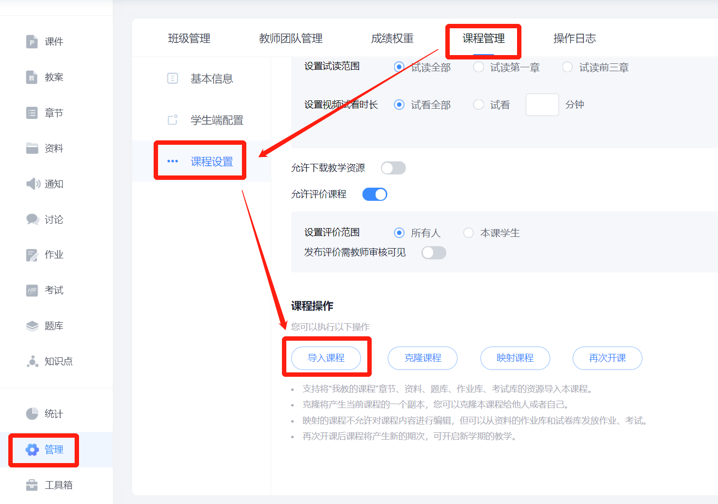 进入课程后,在左侧导航栏找到【管理】——【课程管理】——【课程设置】,在课程设置中找到课程操作中的【导入课程】。